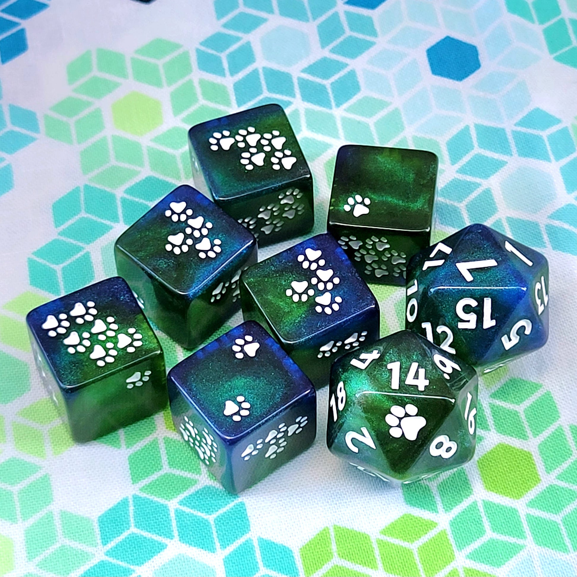 These dice have a super cute trail of pawprints that wrap around in a continuous pattern, making them look like a little critter walked around on them!